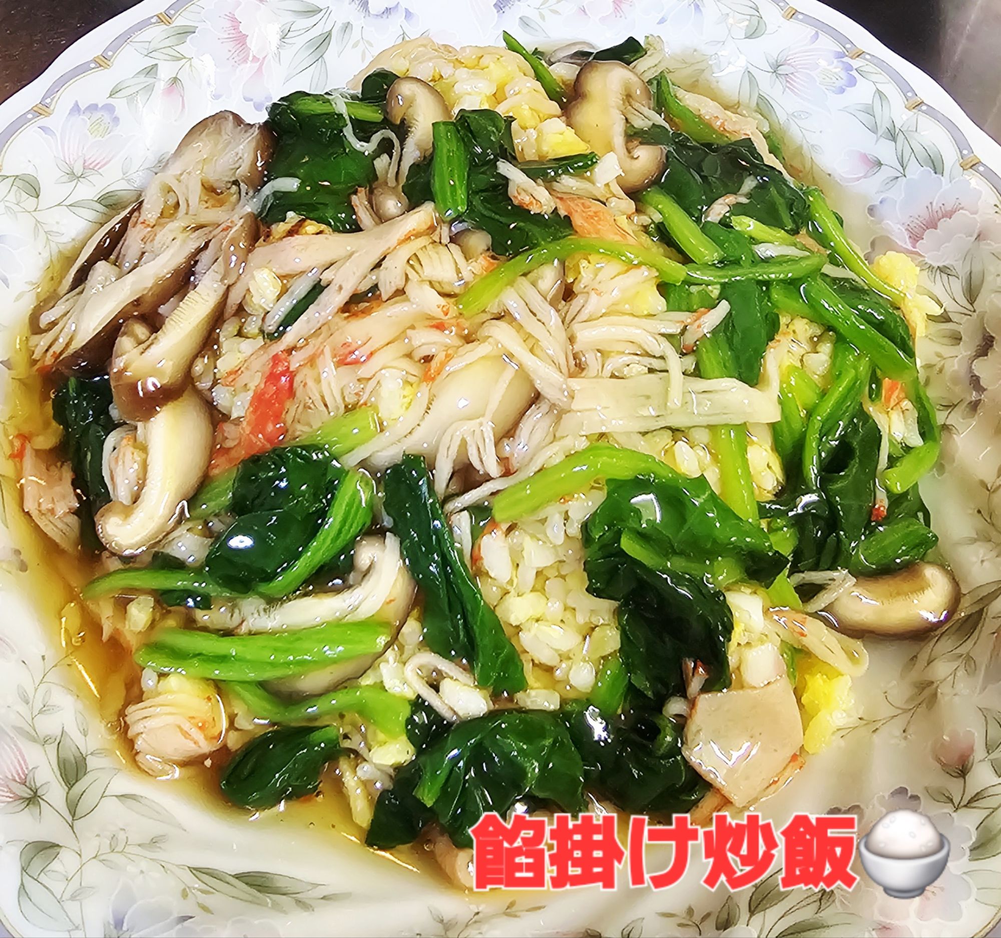 ご飯に卵を混ぜてから炒めたパラパラ炒飯に、椎茸・カニカマ・ほうれん草で作った餡をかけて、サラサラっと食べました(^^)