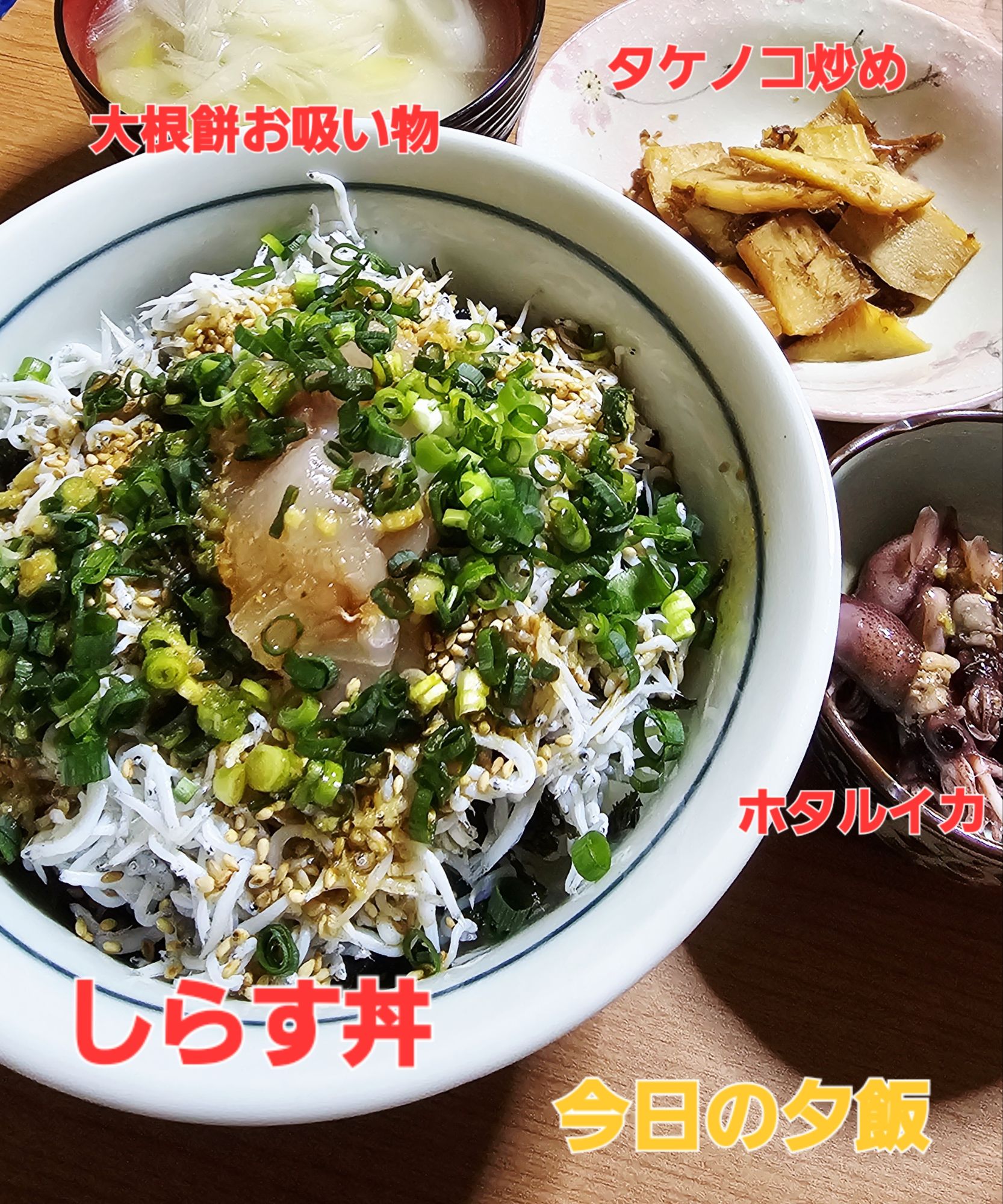 さて、今朝のサムネイル画像は、〖しらす丼とその他〗……昨日の夕飯です♬