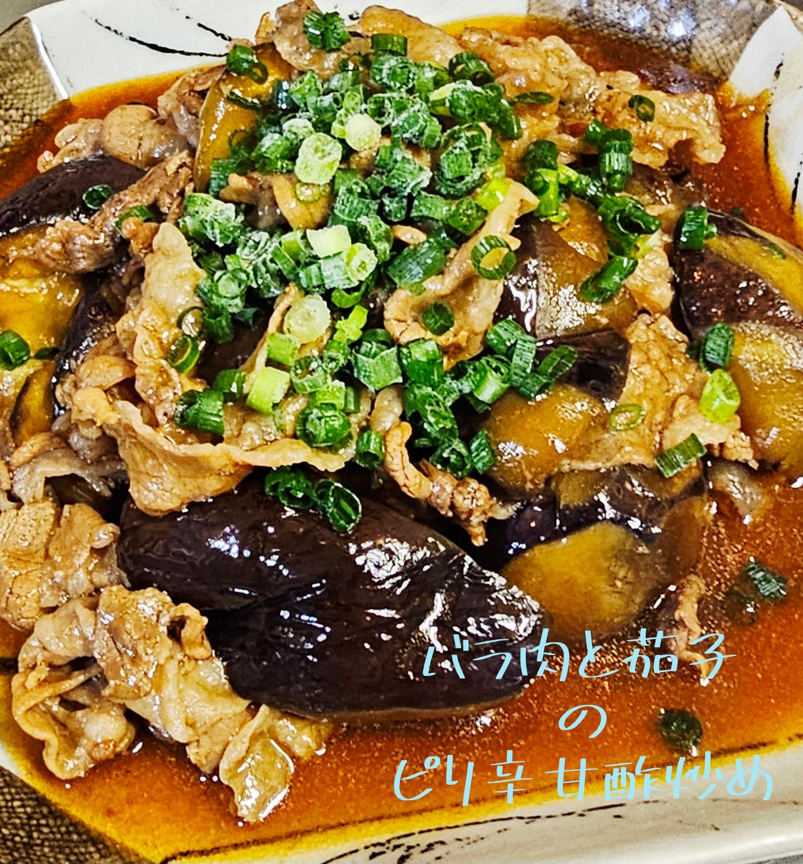 さて、今晩のサムネイル画像は、〖バラ肉と茄子のピリ辛甘酢炒め〗です♬