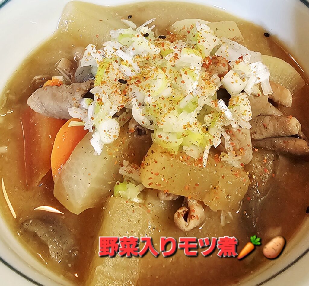さて、今日の夕飯は、〖野菜入りモツ煮〗でした。